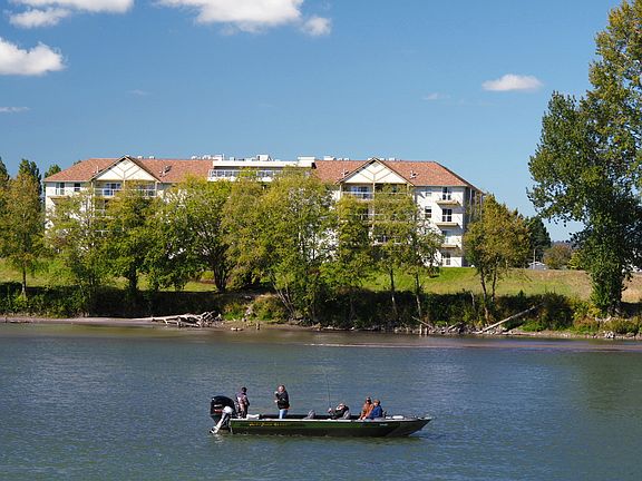 This river-front condo has a great location on the Cowlitz River facing the river, park-like back yard, patio and walkway. It has a gas connection for your BBQ on your private patio/deck. Live the good life with a luxurious living room with gas fireplace and beautiful river view. 2 bedroom, 1.75 bath with jacuzzi in master bath. Large kitchen with walk in pantry. Plenty of storage. Condo amenities feature a 1st floor work out room, a 4th floor community room with rock fireplace and kitchen/dining area facing the river, and a 5th floor large community sun deck. This condo also has it's own private sundeck with river view. The kitchen has seamless manufactured rock counter-tops, real cherry wood cabinets, and appliances included. It has many closets, including a large walk-in closet and storage space and a large walk-in pantry. Your own clothes washer and dryer are included in the unit. This condo has easy access to elevator, lobby, stairs, and secured covered parking garage. You can BBQ on your own private deck, or BBQ outdoors in the large community backyard BBQ area. You can enjoy the large riverfront backyard, as well as walk or bike along trails by the river. There is a fitness center with exercise equipment on the ground floor. You can entertain or relax in our large comfortable common areas. River's Edge Condos is located in Longview WA, near Kelso WA, 5 minutes from shopping, banking, and Interstate 5. If easy living and wonderful views are what you're looking for, this riverfront community is perfect for you. Hi, I'm Charles Bond, developer/owner of unit 307. I'm selling it myself as a "for sale by owner". Please call Linda (my assistant) at 360-425-1517.