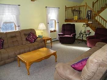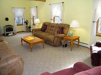 COUNTRY HOME WITH PRIVATE SETTING Come one; come many to this spacious home on 5+/- acres that has plenty of room for family and friends. Main level features living room with open beamed cathedral ceiling, eat-in kitchen/dining area with new ceramic tile, two bedrooms and full bath. Upper level has loft with skylights, bedroom and full bath with laundry. The lower level, with additional separate entrance, has second kitchen, living area and two more bedrooms. There is also a two car garage with finished space above.