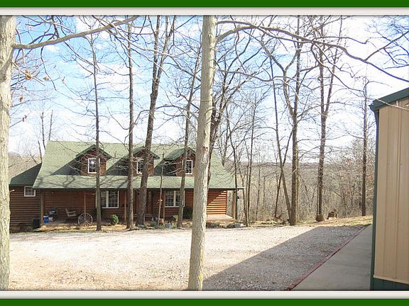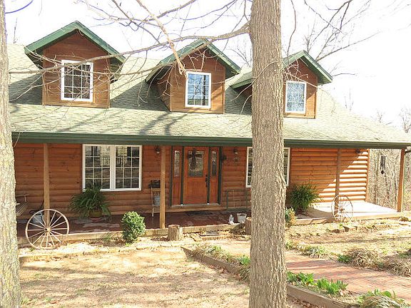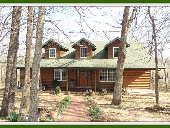 IF COUNTRY LIVING IN A LOG HOME is on your Bucket List, then see this secluded LOG HOME perched on a hill hidden by trees at the end of a private drive on 5.62 mostly wooded acres. One owner home with walk-out basement PLUS a detached 30x40 2-Car Garage/Workshop with concrete floor, 2 overhead doors with openers, 110 & 220 PLUS a 10x40 overhang on back. The home, with its large covered Front Porch, has wood flooring beginning at the Entry running into the Living Room, Dining Room & add'l open Sitting Area and features an open cathedral ceiling with ceiling fans, floor-to-ceiling stone gas log Fireplace with exterior doors on both side for access to the back deck which runs the entire length of the home. The Kitchen is well designed with tile flooring, lots of Knotty Hickory cabinets with