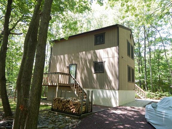 This beautiful Home has been lived in, loved and meticulously maintained by its One Owner. Situated on nearly a half acre wooded landscaped lot on a quiet street in a very nice lake community in the Pleasant Valley School District. Enjoy the open floor plan with lots of natural light through oversized windows & Sky lights in Living room w/Fireplace, natural beams and newer Casablanca ceiling fan and light fixtures! Bedroom on first floor with connected full bath, and Master bedroom upstairs with Jack and Jill bathroom connecting the bedrooms. All bedrooms boast 2 windows each for plenty of natural light. Home also has a full walk out basement for storage and plenty of room for a workshop. This well built home needs a new caring owner to look after it. Call Ed to come see it today, 570-242-8518 Text friendly.