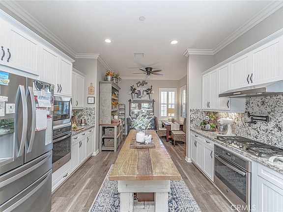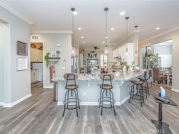 Welcome to this stunning 2 bedroom, 2.5 bathroom home, nestled within the prestigious FOUR SEASONS (55+ Resort Style Community). This property boasts an array of luxurious upgrades and features, designed to enhance comfort, convenience, and style. As you step inside, you'll immediately notice the elegant crown molding that graces the ceilings, adding a touch of sophistication to the living space. The gourmet kitchen is a chef's dream, equipped with a stainless steel package that includes double ovens with European convection capabilities, perfect for culinary enthusiasts. The interior showcases exquisite luxury vinyl flooring, offering both durability and aesthetic appeal. French doors lead from the master bedroom, guest bedroom, and living area to the patio, seamlessly blending indoor and outdoor living. The kitchen and laundry room feature stunning Alaskan quartz countertops, while the baths, including the powder room, are adorned with Italian quartz countertops, exuding elegance and charm. Both bedrooms are adorned with cashmere carpeting and upgraded pet-proof padding for added comfort and practicality. Throughout the home, you'll find bronze oil-rubbed fixtures, adding a touch of warmth and sophistication. The master bath boasts upgraded custom tile work, while Thermofoil cabinetry can be found throughout the house, providing ample storage space. Stay cool with Hunter ceiling fans throughout the home, and illuminate your space with oil-rubbed bronze and glass pendant lights over the breakfast bar, as well as a custom oil-rubbed chandelier in the dining area. Additional features include a pot filler in the kitchen, a bay window in the master bedroom, and an instant hot water heater for added convenience. Outside, the entertainment area features a gas fire pit, perfect for gatherings with friends and family. Custom planters adorn both the front and backyard, adding to the property's curb appeal. A sprinkler system ensures easy maintenance, while an alumna wood patio cover provides shade and shelter. The luxurious Four Seasons gated community has a wide variety of activities and clubs to choose from, you'll have countless opportunities to meet new friends and stay active as you choose. Whether you're seeking relaxation, socialization, or adventure, the Four Seasons community offers the perfect blend of amenities to suit your lifestyle needs. Welcome home to resort-style living at its finest.
