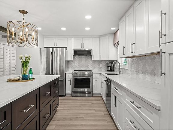 Designer detailsAbundant white cabinetryStained wood islandBella pietra quartz countertopsZellige style herringbone backsplashCoretek flooringPlantation shutters