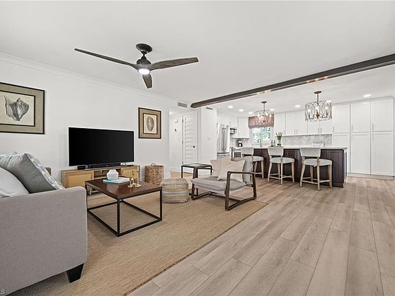 Thoughtfully remodeled first-floor 2b-2b-2 parking spots & extra storage end unit, just moments from the sugar-sand Gulf beaches and vibrant 5th Avenue South, blends timeless design with modern comfort. A prime location with serene views of the landscaped common area creates the perfect retreat in the heart of Olde Naples. Inside, warm whites and neutrals set the tone, with Sherwin Williams’ “Greek Villa” paint unifying walls, ceilings, and trim. The chef’s kitchen shines with KitchenAid stainless appliances, abundant white cabinetry with two large pantries, a utility pantry, soft-close drawers. A stained wood island anchors the space, designed for cooking and entertaining with easy-access drawers and extra hidden storage. “Vintage” quartz counters, a pearl-toned zellige style herringbone backsplash, and Gabby statement lighting add a touch of elegance. The residence continues with Coretek flooring throughout, plantation shutters, and designer details such as Ballard Designs bath mirrors, My Shower Doors enclosures, and Elfa adjustable closet systems in every room. Bathrooms feature Bella Pietra quartz countertops, tile showers, and sleek tile flooring. Comfort upgrades include a new HVAC system (2023), tankless water heater, hurricane impact windows and sliders, and shutters on the lanai. Outdoors, lush new tropical landscaping surrounds the villa, creating a tranquil backdrop. An LG washer/dryer and high-end fans by Fanimation and MinkaAir add everyday convenience. Furnishings and accessories—curated from Patina Collection, Arhaus, The Striped Cabana, Revival Rugs, and other premium sources—are negotiable. Royal Bay Villas offers a resort-style lifestyle with pickleball, tennis, and pool amenities, all in a rare concrete block community west of Tamiami Trail. Whether as a year-round residence, seasonal escape, or investment. You have found the perfect invitation to enjoy the best of Downtown Naples living. Ps bring your family & friends Unit 76 is available as well...