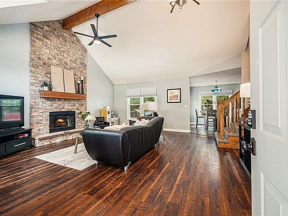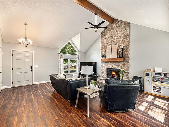 Charming 2 Story home in Olathe! Large, inviting great room with a vaulted ceiling, gorgeous wood beam, and a beautiful stone fireplace. Spacious kitchen with quartz countertops, stainless steel appliances, and a gas range. Main floor laundry and half bath. Nice primary suite with a private bath and two walk-in closets. Two generous secondary bedrooms and an additional full bath on the second floor. Finished walkout lower level with a family room, game room, and 4th bedroom. Two-tier deck, patio, and firepit area for entertaining, plus a shed and playhouse. Great location, walking distance to Prairie Center Park and just down the street from Ernie Miller Nature Park. Close to shopping, restaurants, and schools.