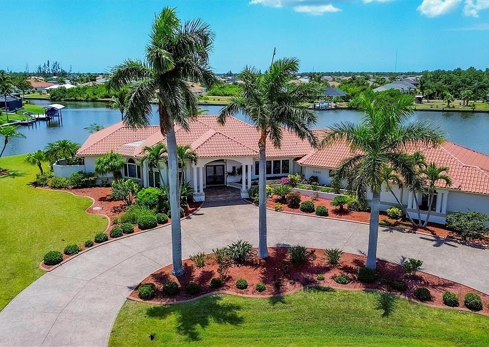 Experience luxury waterfront living at its finest with this rare gem nestled on an oversized tip lot boasting an impressive 440 feet of waterfrontage. This exquisite home features 3 bedrooms, 2 1/2 baths, plus a versatile bonus room perfect for a study, office, or additional bedroom. Situated on a canal front with just one bridge separating you from the enchanting waters of the lagoon, Myakka River, and the expansive Gulf of Mexico, this home offers unparalleled access to Florida's breathtaking waterways. From the moment you arrive, you'll be captivated by the impeccable curb appeal, adorned with mature landscaping and raised beds. Step through the elegantly etched French doors into the grand entryway, where you're greeted by the spacious family room adorned with a coffered ceiling, offering a sense of richness and luxury. A multitude of windows and sliders provide breathtaking waterfront views and access to the pool area, seamlessly blending indoor and outdoor living. The large kitchen is a chef's delight, featuring an abundance of granite countertops, plenty of cabinets, an island for food prep, stainless steel appliances, under-cabinet lighting, and windows overlooking a spacious lanai. Enjoy casual dining in the kitchen's own dining area with aquarium glass overlooking the pool or entertain guests in the formal dining room boasting ample space with a lighted trayed ceiling. The bonus room, with its two sets of privacy French doors, offers versatility and convenience, centrally located near the half bath, perfect for accommodating guests. The split floor plan ensures privacy for guests or family members, with two bedrooms and a bath leading out to the pool, each with its own patio and water view. Retreat to the primary suite through privacy French doors, where you'll find a separate vanity area with three floor-to-ceiling mirrors, leading to spacious walk-in closets complete with custom shelving and drawers. This luxurious bath area features another vanity, a walk-in shower, private toilet area, and a garden tub surrounded by windows that showcase the beauty of the landscaping. Step outside to the expansive lanai, complete with a heated pool, hot tub, and panoramic views. A large concrete dock with a 20,000-pound boat lift, electric, and water access awaits avid boaters. The property also features an attached garage with three bays totaling over 1,103 square feet and a detached garage with 1,600 square feet, ideal for use as a workshop, complete with air conditioning and ample parking.