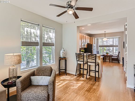 Discover this light-and-bright townhome in a sought-after location. This home is well maintained and move-in-ready because it was used to house traveling designers. High quality interior features including sustainable bamboo flooring and motorized Hartmann&Forbes shades. The main floor features an open living space with dining nook and spacious kitchen. You'll be able to cook with ease with gas appliances and ample cabinet space. Plenty of room for entertainment. Enjoy the low maintenance yard out on the home's Trex deck or stay inside and cozy up to the gas fireplace. Upstairs, two en-suite bedrooms with vaulted ceilings, large closets, and wall-to-wall carpet. Plus both rooms have their own bathroom. Stackable washer/dryer on the same floor as rooms adds to the convenience of this home. There is a bonus garage storage space offers versatility for new home owner's needs. No need to get in the car for grocery shopping, Trader Joe's is across the street! This home also is a short drive to local parks, shopping, I-5/Hwy217 and Lake Oswego Schools. An ideal place to live!
