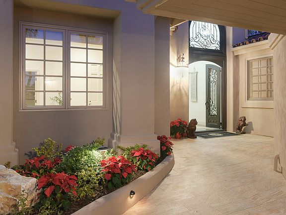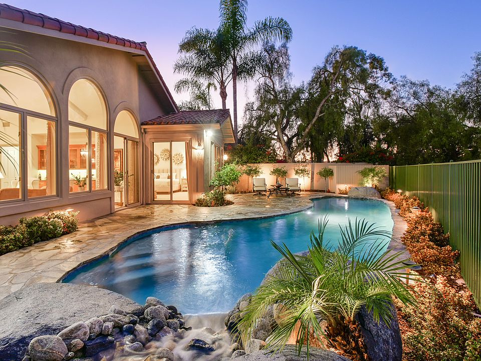 This enchanted property unveils all of the amenities that are A-List priorities for buyers looking to downsize in space but not in sophistication or refined living. Located in the gated Rancho Santa Fe enclave of Del Rayo Downs, the neighborhood reveals just 65 homes and is adjacent to the world-class Rancho Valencia boutique hotel's luxurious spa and award-winning restaurant options. An easy-to-live-in single-level floorplan has been exquisitely upgraded and recently improved to complement today's wide array of lifestyles. Enjoy large floor-to-ceiling windows that bathe the home in natural light, fresh paint, high-quality carpet, new hardware and fixtures throughout, new lighting, remodeled baths, a new security system, and a whole-house water filtration system. Two spacious ensuite bedrooms include an oversized master suite with 2 generous walk-in closets and laundry facilities. A professional office with built-ins by California Closets and a conference area makes working from home a delight, and the great room opens to the outdoors, where San Diego's renowned climate inspires memorable entertaining. Top-of-the-line Wolf and Sub-Zero appliances enrich the kitchen, and an attached 2-car garage boasts custom cabinets and epoxy flooring. Appreciated improvements continue outdoors, where the pool has been updated, stone tile graces an entry courtyard, colorful new landscaping includes new irrigation, and a new roof features solar panels. Del Rayo Downs is convenient to the shops and restaurants of Rancho Santa Fe's Village, as well as beaches, acclaimed schools, recreation and downtown San Diego.
