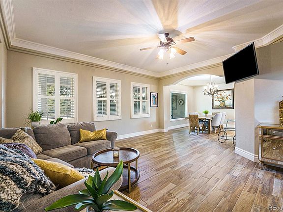 - Description: Soaring 2-Story Foyer Flanked By An Elegant Curved Staircase, Wood Grain Porcelain Tile Floors, Shutters And Tray Ceiling