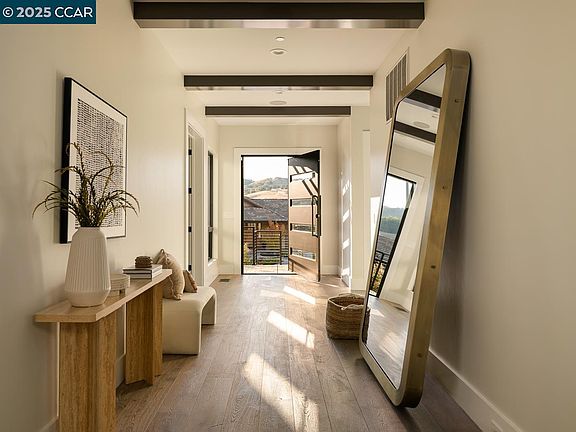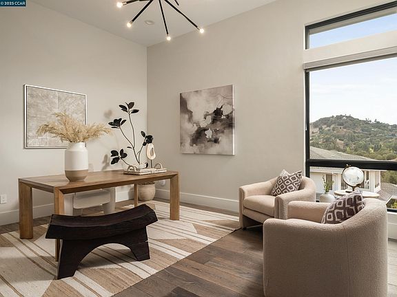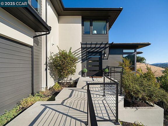 This extraordinary modern contemporary home was designed by architect Steve Kubitschek and built in 2019. Experience elevated modern living, curated for those who appreciate exceptional quality and design, in a serene and exclusive enclave of Lafayette's Reliez Valley. Complete with a secure, gated entry, a double-edged infinity pool overflowing into hillside views, and sunsets that will take your breath away. Spanning 4,953 square feet, this residence features five bedrooms and six bathrooms, including two entry-level suites and a private office. The open floor plan is accentuated by soaring 12'+ ceilings and designer finishes. The chef's kitchen is equipped with Thermador appliances, and the dining area boasts an impressive walk-in wine refrigerator with 8' glass doors for elevated entertaining. Step outside onto the brand new 900+sqft wide plank deck with built-in BBQ and enjoy the stunning panoramic views over the sparkling double-edge infinity pool and spa. The property sits on a 22,170 square foot lot, with awe-inspiring views of the Lafayette hills. 155 Arbor View Lane is Lafayette modern living at its absolute finest.