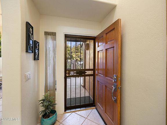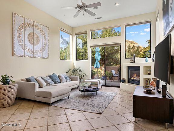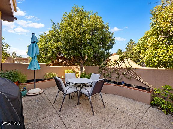 Come enjoy this elegant and upscale townhome, resting along West Sedona's coveted Dry Creek Corridor! Nearby hiking and biking trails in the National Forest and close to all of the amenities in town. Single level floor plan nestled on a cul de sac and bathed in natural light under soaring ceilings and stunning view windows. Architecturally appealing and enhanced by thoughtful, tasteful appointments, including: Brazilian Tigerwood floors, granite countertops, custom cabinets in the spacious, open kitchen; featuring Bosch and GE Profile appliances. This bright, light and open home boasts skylights, and a fireplace, with newer heating & air conditioning systems. Enjoy outdoor living on two different patio areas with a relaxing water feature. Neighborhood swimming pool & hot tub too. MORE . . HOA fees cover the roof, exterior maintenance (paint & stucco), insurance, water, garbage collection, some landscaping, yearly maintenance of fire sprinklers, common areas, swimming pool, hot tub & road maintenance. Some furniture available separately.