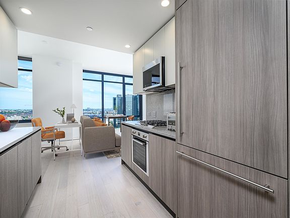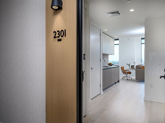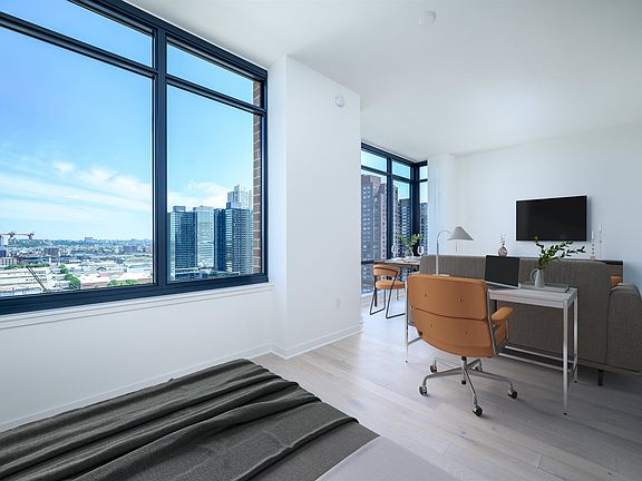 This is 2301 on the 23rd floor, the highest studio in the building. A 1-bedroom size Studio located in a brand-new condo building, this unit offers a smart layout and a true MASSIVE walk-in closet. Floor-to-ceiling 10 ft. windows let in ample natural light, even on cloudy days. The studio also features an in-unit washer/dryer with an external vent and high-quality construction. Situated on a quiet street within a vibrant neighborhood, it's just a 3-block walk to the Path station, which is only 2 stops from Manhattan. You'll also find groceries, restaurants, coffee shops, shopping, and various entertainment options nearby, including a movie theater, fitness classes, a dancing school, and a performance art center. The building offers top-notch amenities such as a 24-hour doorman and concierge service, a swimming pool, a fitness center, a yoga room, an arcade room, a sky lounge, a resident lounge, a children's room, a dog wash, a dog run, a bike room, and optional garage parking. Reach out today to be the FIRST to live in this brand new Toll Brothers Building. Parking may be available for rent.