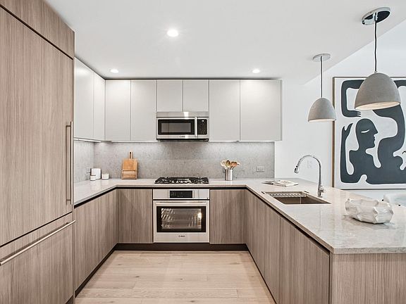 The open-concept kitchen effortlessly integrates the living and dining areas and is appointed with custom Italian walnut and dove gray cabinetry, quartz countertops, and Bosch and Thermador appliances. The primary suite offers a peaceful retreat, featuring a spacious layout with walk-in closet. The spa-inspired bathroom with shower-tub featuring custom vanities, Kohler fixtures, and elegant porcelain tile accents.