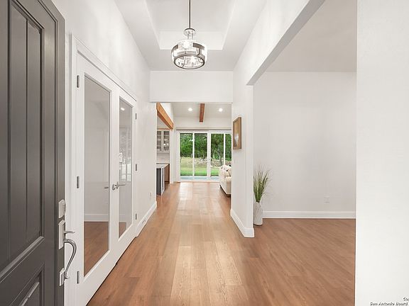 Texas character meets refined modern design on 1.16 acres in sought-after Rayner Ranch community of Spring Branch. This thoughtfully designed single-story custom home offers 4 bedrooms, 3.5 baths + private home office with upscale finishes throughout. Built with accessibility and long-term comfort in mind, the home features 42" wide hallways, ADA-compliant doors, and dual primary suites with recessed roll-in showers, grab bars, and abundant storage. The open-concept kitchen is a chef's dream with quartz counters, an oversized island with seating and built-in outlets, Rev-A-Shelf organizers, undercabinet lighting, custom cabinetry, and motion-sensor lighting in the pantry and back hall. A French-door study, formal dining with butler's pantry and dry bar, and cathedral-ceiling living room with wood beams and fireplace complete the heart of the home. Outside, a covered patio with wood ceiling overlooks a fenced yard shaded by 36 mature oak trees and accented by a greenhouse, fig trees, and solar-lit fencing. The property is casita-ready with water, sewer, and electric hookups already in place, offering room for future guest quarters, pool, or workshop. Additional highlights include 4-side masonry construction with gutters, a 500-gallon propane tank, Ring security system, water softener, RO system, tankless water heater, and an oversized side-entry garage with attic storage and insulation. Conveniently located near Canyon Lake, Guadalupe River, Bulverde, and New Braunfels, this home provides a rare opportunity to enjoy privacy, functionality, and refined Hill Country living in a gated community with Serenity Oaks amenities.