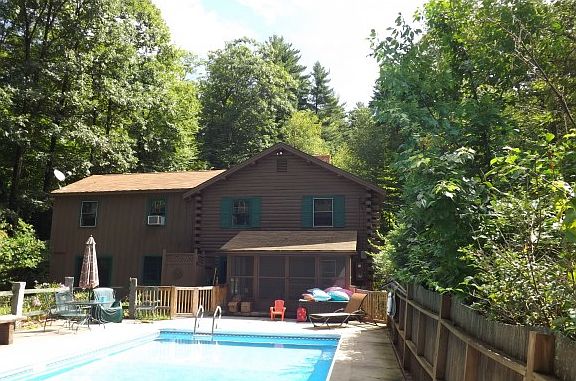 Tuck into woodlands and lawn in your own home which feels like a magical get-a-way. Just 5 minutes to Henniker Village amenities, Pat's Peak Ski Area, New England College and commuter routes, I promise you will feel the enchantment. This is a custom log home with room to spread out, entertain, live and enjoy peace year around. The custom kitchen is recent, the bathrooms incl master w/ jetted tub. Glowing pine floors and walls, abundant windows, entry on two levels, with master directly to in-ground pool area with adjacent screen porch. If you haven't ever enjoyed the glory and solitude of an out-door shower------it is a true treat awaiting you! Main stair case access to lower level, as well as a second circular stair case directly to master, but not needed. Enjoy the photos but do come for a delightful visit!The two story detached garage has a second story awaiting your needs and dreams!