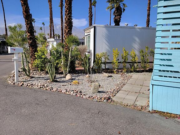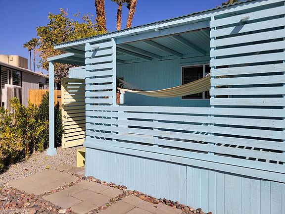 Adorable!!!! 1 bedroom/1 bath, partially furnished, large kitchen includes pantry with moveable storage. This home has 2 storage sheds with the one off the patio designed to be an art studio or man/woman cave or shed. Nice sized enclosed yard, very private. Lovely porch (hammock area) or outdoor living space with mountain views. New AC unit (9 months old). Sits on a quiet cul de sac. Royal Palms offers many amenities such as pool/spa, fitness center, saunas, shuffleboard, pickleball, large clubhouse with full kitchen and a very social neighborhood community. Come and see this charming little gem! Park approval required. New owner to pay $775/month. 55+ Community
