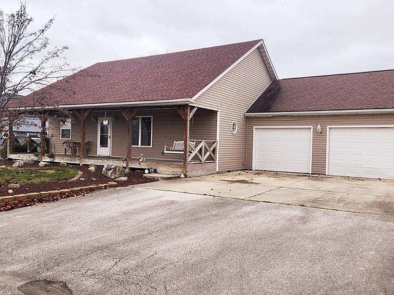 Welcome to 155 Dickman, nice covered front porch, carpet in living room and tile in bathroom 2023, open floorplan, neutral décor, large 2 car att garage, shed, walk in closets in both bedrooms.
