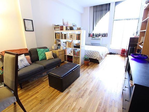 Approximately 500 square foot studio with unreal sunlight through huge arched window, 11 ft ceilings, great closet / storage space and hardwood floors. The building is a prewar elevator midrise that used to be a Piano Factory and was converted into very large and lofty apartments. There is laundry, video intercom security and a live-in super. Dogs are case by case. Cats ok