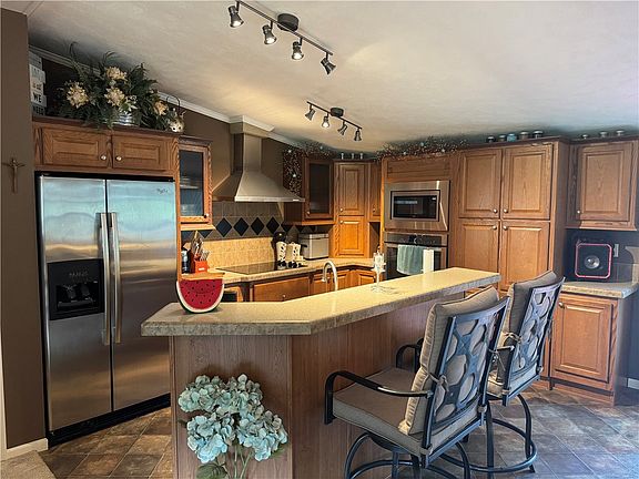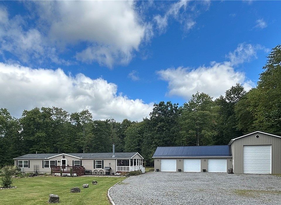 Escape to your own private retreat with this unique property located in a beautiful park-like setting. This home offers easy one-floor living with a smart, flexible layout. The kitchen provides generous counter space and cabinetry, with a dining area that opens to the back deck Family room with wood burning fireplace and complete with wet bar and sit at bar with sliding glass door for access to the side deck making this a great place to entertain. Master bedroom with walk in closet and master bath with tons of storage. Outside, the oversized detached garage is a dream—three standard bays plus 50X30 bay for RV or heavy equipment and an additional equipment shed. Large gravel lot provides space for all your vehicles, while the landscaped yard is filled with flowers, shade trees, a footbridge and garden shed. A standby Generac diesel generator that powers the house and garage. Easy access to I-80 & I-79.
