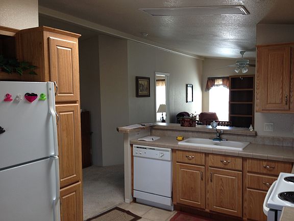 2004 Cavco 28x52 slip side doublewide 2bedrooms and 2baths All appliances including microwave, washer, and dryer Large master bedroom closet ,Large carport awning, Kitchen skylight and 2 ceiling fans, 10x10 Matching hardboard sided shed, Front separate kitchen area with windows, Heat pump, Sit down bar counter with 2 schools, Full active community with card room, pool tables, shuffleboard, workout room,and heated pool. Available to see by calling the in the park specialist agent Cindy @ 520-560-6065