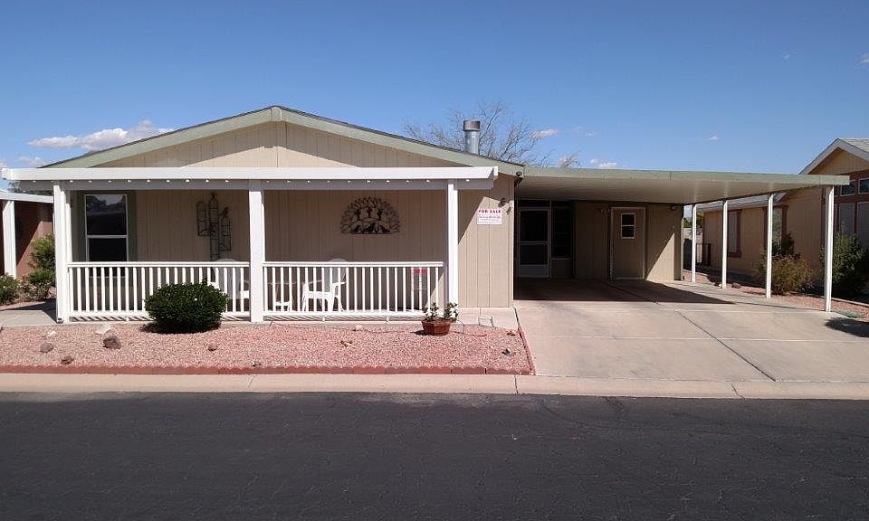 Upgraded 2003 Palm Harbor Manufactured Home. 26'W x 60'L 3 bedroom, 2 bath Features: Entry foyer from front entrance to living room area Built-in Gas Fireplace and Large Plasma TV in living room Lighted bar seating between living room and kitchen. Extra large kitchen (22' x 13') with island, plus table. Many cupboards including large pantry. Pull out shelves- Glass top stove, microwave, stainless refrigerator and dishwasher. Reverse Osmosis system. Large master bedroom suite. Master bath features spa tub, double vanity, 5' shower and walkin closet Split bedrooms. 2 bedrooms are on opposite end of house from master bedroom, each with its own walk-in closet. Solar Tube in 2nd bathroom. Laundry room with new washer/dryer and two storage closets. Ceramic tile floors in bathrooms, kitchen, laundry room , hallways and one bedroom for easy maintenance. Enclosed sun room (420 sq.ft) with access to patio. Plastic windows and solar shades. Vaulted ceilings and ceiling fans throughout. Full House Water Softener system Large patio and landscaped backyard with sprinkler system. Backyard is on the perimeter of the community, with no neighbors behind. Completely fenced for pets, with two side gates to front 3 year old air conditioner and gas furnace. Gas water heater 8 x 12 workshop with electricity. Long driveway with carport accommodates two cars with room for visitors. To view this home call Cindy Bergen, agent @ 520-560-6065