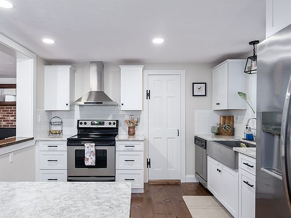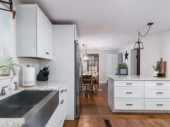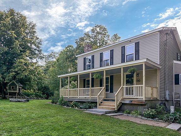 Tucked back from the road the long driveway brings you to this fabulous home . The front farmers porch welcome you in where you will be met with a spacious entry way complimented by refinished wide pine flooring, a warm inviting LR with fireplace with wood stove insert open to NEW kitchen with trendy white cabinetry , farm style sink, breakfast bar with granite counters, SS appliances all accented with subway style backsplash leading to daily dining room . 1st fl bath has also been remodeled offering a walk in show with a spa style feel. Mudrm is larger than most doubling as a storage area and access to back yard . 2nd floor overs 3 spacious bedroom with painted wide pine floors, custom built ins in the primary suite and private full bath with claw foot tub . On over 5 acres of land you have multiple outbuildings , trails, and gorgeous front area frames by wood fencing , stone walls and welcoming pillars offering an estate feel. Bonuses: new roof, 1st floor windows