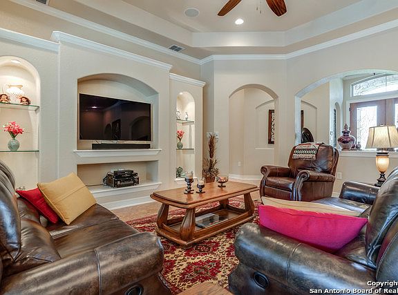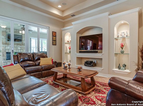 Backs to 17th fairway. So many details; open floorplan, high ceilings, built-ins, & bright light. Accordion glass doors disappear & open the family rm to Florida rm w HVAC & resort style backyard. Kitchen w granite counters, SS appliances, center island , gas cooktop w bkfst bar opens to family rm & Florida rm; 2nd Study & 2 bedrms w a Jack & Jill bath. Master suite separate from other rms has 2 sided fireplace & office w closet; could be 4th bedrm. cabana w kitchen+detached 1 bay garage w water & AC.