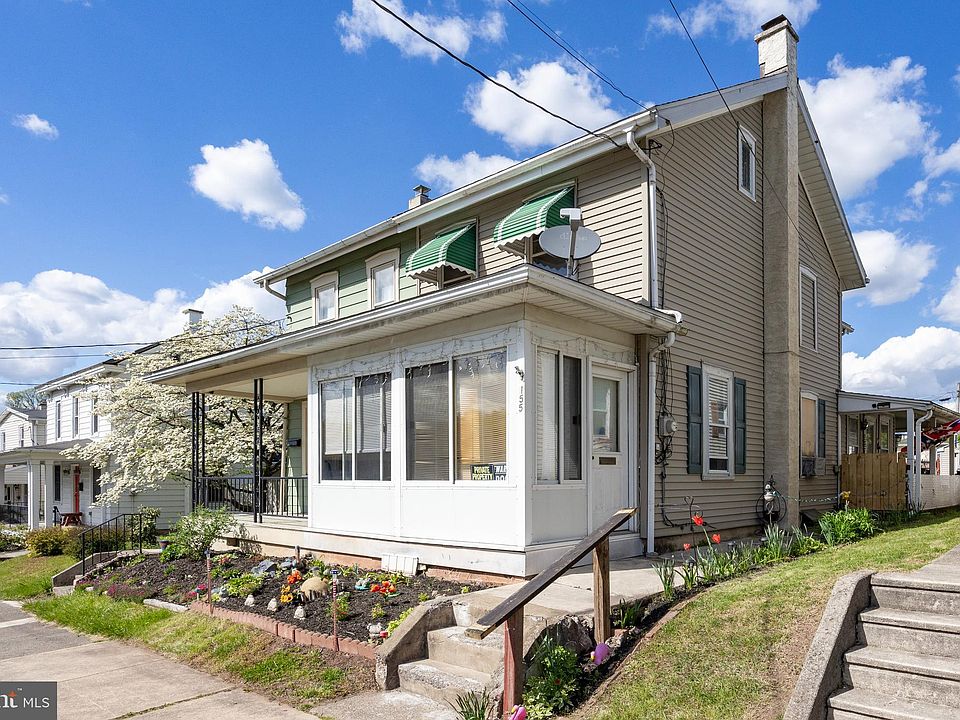 Come see this 2 bed, 1 bath twin nestled in Birdsboro! Step into the sunny, enclosed porch leading into the spacious living/dining area. Enjoy the additional living space, perfect for a family room or dining area, just off the kitchen. The kitchen features dark wood cabinetry and matching built-in bench seating. Access the covered patio and deck from the kitchen, overlooking the fenced-in backyard with a shed. Upstairs, two well-proportioned bedrooms share a hall bath with a sizable vanity. The unfinished basement provides ample storage and laundry area access. Additional off-street parking options are available in the rear of the property. This home is being sold in as-is condition.