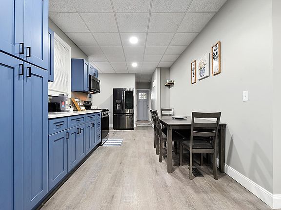 Modern quartz countertopsOne-level livingBlue shaker-style cabinetryMosaic ceramic tileSmart fridgeBrand new bathroomBrand new vanity