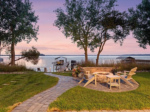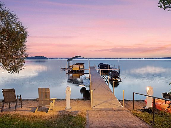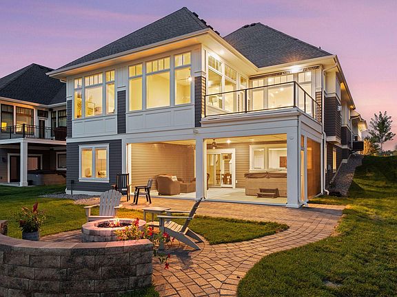 Welcome to the Shores of Lake Waconia, an exclusive community of luxury detached villas offering easily accessible, dedicated dockage and a sandy lakeshore on Lake Waconia. Crafted by Charles Cudd in 2022, this architecturally designed villa showcases panoramic, west-facing lake views from nearly every room, and a bright, open interior designed for both everyday comfort and effortless entertaining. The main level features a gourmet kitchen with informal dining, a welcoming great room with fireplace, and an oversized sunroom with a wall of windows leading to the lakeside deck. The walkout lower level expands the living space with an entertainment-style family room featuring a wet bar and amusement area, flex room, and guest accommodations. Outdoors, enjoy a phantom-screen porch with a hot tub, gas fire pit, and easily accessible shoreline with shore power and water. With association-maintained dockage, lawn care, and snow removal, this home is truly turnkey for both seasonal getaways and year-round living. A custom elevator effortlessly connects the main and lower levels. Community amenities include a playground, private beach access, and walking paths that lead directly to downtown Waconia.