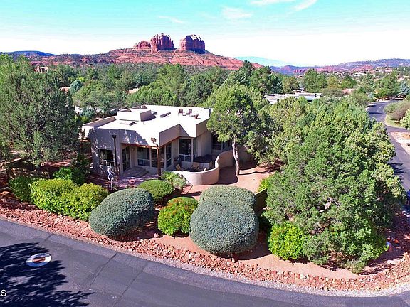 This one of a kind 2363 SF custom home, located in the Chapel area with unobstructed Chapel of the Holy Cross views and red rock formations from inside the home, is waiting for a discerning buyer. Within 200 ft. of a network of hiking trails (Cathedral, Bell Rock, Courthouse, Chicken Point), home offers many other bonuses as well, including a viewing deck w/360 degree views, extensive outdoor patio and viewing seating areas, hot tub, privacy landscaping, RV carport, shed, to mention a few. The Great Room offers warmth of a split cedar ceiling, canned lighting and walls of windows bringing in the red rock views. When you enter the home, you see million dollar views from Great, Dining, Dinette, Kitchen rooms and Primary bedroom suite. Come be surprised and bring your suitcase; move in ready