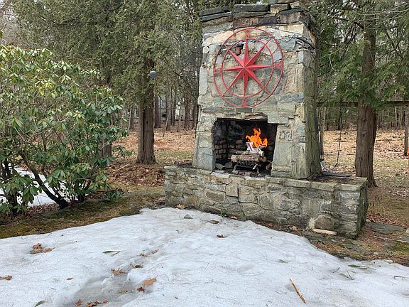 Enhancements unique to the home and property include a wood-burning fireplace surrounded by custom-built cabinetry in the living room, a cozy in-kitchen dining nook warmed by a wood-burning stove and overlooking the original outdoor stone fireplace and patio, easily accessed from the living room.