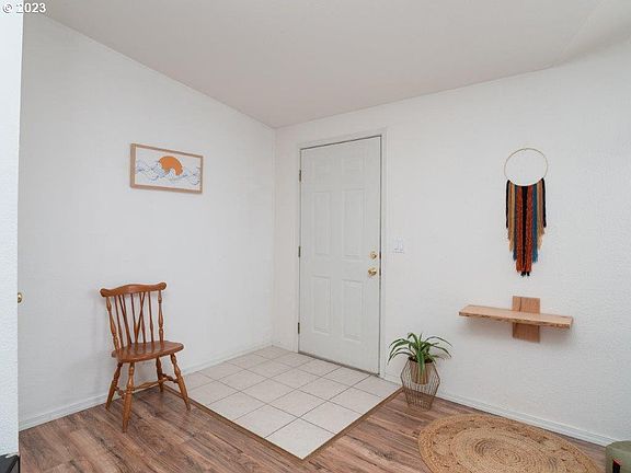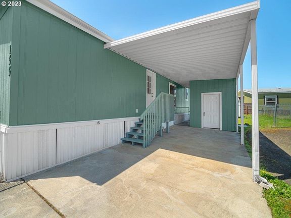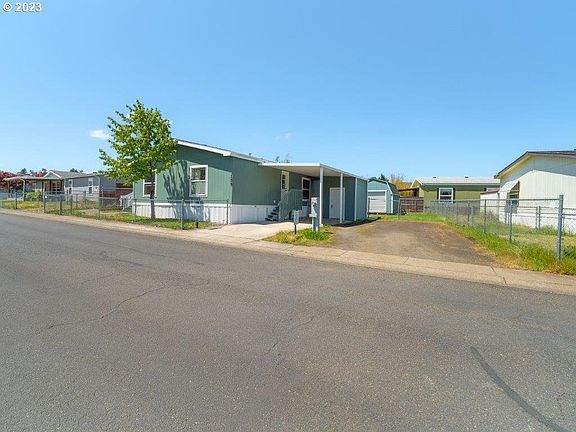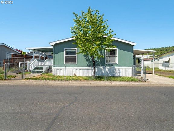 Split-room layout home right in Roseburg's River Place MFH Park. Inside you will find a spacious primary room with bathroom and large walk-in closet, inviting living space, kitchen with pantry, and much more. Heat pump for heating/cooling. Outside you can enjoy the covered deck and large fenced yard. Carport room and outbuilding for all of your storage needs. And last, but no least LOTS of parking space! Space rent $715/Mo (utilities not included). New exterior paint and some interior paint. Book your showing today!
