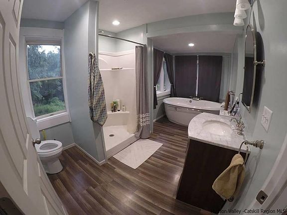 SUPER LOW TAXES! Single story living at its finest! Stone work surrounding oversized porch with new wood decking. WALK IN AND FALL IN LOVE with this open concept home. Master bedroom with on suite bathroom boasts stainless rainfall showerhead. Main bathroom has jetted freestanding tub and marble countertop complemented by kohlers "iv georges" top line. kitchen has solid wood cabinets topped by granite countertops with Samsung stainless steel appliances. Living room has vaulted ceiling and brick electric fireplace that doubles as an additional heater for cold summer nights. Dining area has brand new wood stove. New boiler in 2016. New hot water heater 2015. New roof 2015. Living room leads out to charming back patio area surrounded by producing vegetable garden and mature peach trees. Included in this purchase is second lot of 0.58 acres behind home. lot number 95.4-3-23. THIS WILL NOT LAST AT THIS PRICE!