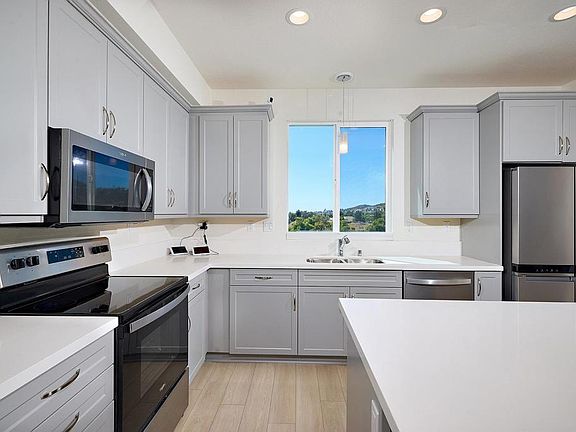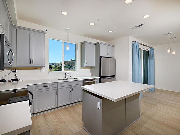 THIS UNIT HAS SOLAR!!! BUILT IN 2023! Discover contemporary living in this stunning 2-bedroom, 2.5-bathroom townhome. The open-concept living area is bathed in natural light, creating an inviting space for relaxation and entertaining. The kitchen is a chef’s dream, featuring Quartz countertops, sleek upgraded cabinetry, pendant lighting, and stainless steel appliances. Whether you're cooking for one or hosting a dinner party, this kitchen is designed to impress. FHA and VA approved! Upstairs, you'll find two spacious ensuite bedrooms, each with ample closet space and modern private bathrooms, offering comfort and privacy for everyone. Step outside onto your private balcony, which offers views of the surrounding hills and neighborhood. It is ideal for morning coffee or evening relaxation. This home has modern amenities, including a dual-zoned HVAC system, an in-home air duct air purifier, and two smart thermostats for optimal comfort and efficiency. The property is also SOLAR-powered, reflecting a commitment to sustainable living. A modern fire suppression sprinkler system adds an extra layer of safety. The townhome is easy to maintain, with no carpeting throughout. It boasts a clean, contemporary aesthetic, and the two-car garage is perfect for direct and easy access. You will be minutes from Highway 78 & Interstate 15, with close access to Cal State University San Marcos, the brand new Kaiser Hospital and Medical Center, the SPRINTER station, supermarkets, popular restaurants, the San Marcos community center, the library, and all the enjoyment of the San Marcos lifestyle! Don't miss the opportunity to own this beautifully designed, energy-efficient townhome in a prime location! Photos are virtually staged.