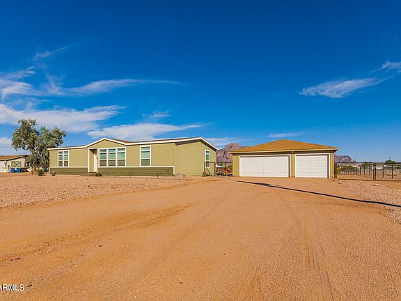 NO HOA! FENCED HORSE PROPERTY! 2 RV GATES! Spectacular mountain views! This spacious home is just over 1 yr old. See the mountains from the back patio & gorgeous sunsets out your front door. Split floor plan w/ great room. Kitchen w/ huge walk-in pantry, large kitchen island & oversized cabinets. Patio door off of dining room leads to paver patio and walkways. Large laundry room. Spa-like primary bath w/ tiled shower. All bedrooms have walk-in closets. Front low maintenance landscaping. Custom expansive extended length 3 car detached garage for all of your toys. Double RV gates allow easy access for RVs, boats, and trailers. Bring your horses, the level lot is perfect for corral/round pen or a backyard oasis pool. Just minutes from trail access, ride out of your yard & hit the trail! So many reasons to buy this home! Upgrades & amenities galore make it feel like a custom home. New oil pipe with no climb fence. Located near the 88 which takes you to the canyon, perfect for boaters! No HOA's or CC&R's. Property continues past the fenced area through the wash w/ poles to mark the perimeter. Close to trails, shopping, restaurants and the 60. AZ water. City amenities with a country living feel. This is NOT your average manufactured home! Move right in!