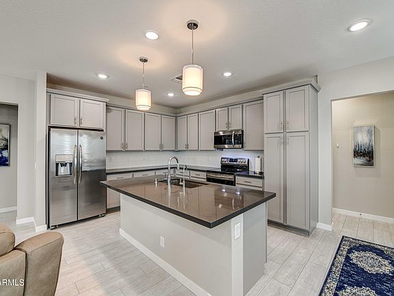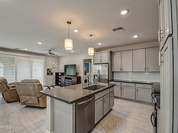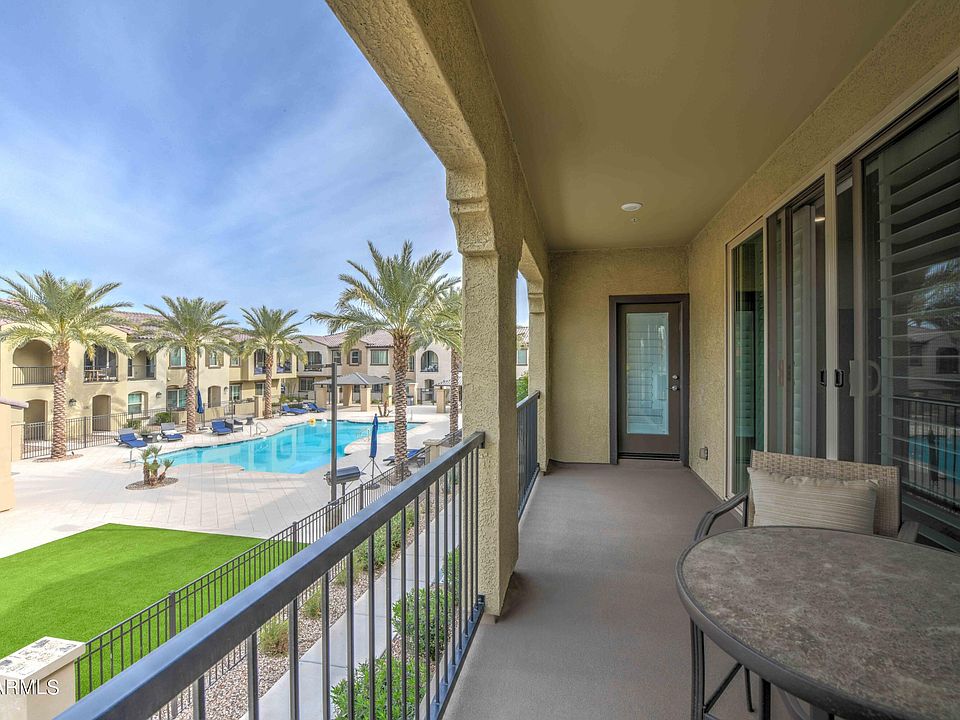 This Stunning Model Condo is the single largest in the community and is close to all of Chandler. This Model Home sits on a corner lot with a split floor plan! Master suite is off the main living area and the secondary bedrooms are on the other side of the property. Two stunning bathrooms and great closet space too! Beautiful views of the community pool and lots of room to relax on the spacious balcony. Beautiful tile flooring in the main living areas and carpet in the bathrooms. Neutral paint throughout. Quartz countertops in the kitchen & bathrooms. Your new kitchen offers stainless steel appliances, upgraded cabinets with a ton of storage space, and an island with breakfast bar. Epoxy flooring and custom storage cabinets in the garage.