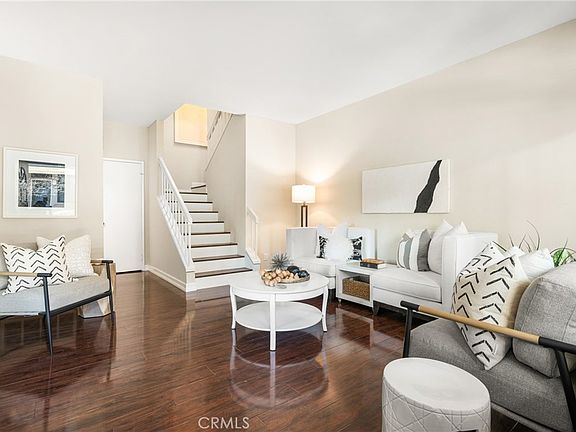 This gorgeous remodeled 3 bedroom two story townhome is in mint condition from top to bottom. Nestled in a quiet community in Orange and tucked at the base of the Orange hills, this townhome feels like home. With only one shared wall, this home is light and bright with wrap around windows and volume ceilings. The updated kitchen feels gourmet, with granite countertops, rich cabinetry and a sink overlooking greenery, plus the stainless steel refrigerator is included. Meals can be served at the countertop bar or in the breakfast nook where the slider opens to your own shaded patio. The spacious living room showcases the wood-like laminate flooring which is throughout the home (no carpet), and a convenient powder bathroom is downstairs. Upstairs are the three bedrooms including the primary suite, all spacious in size with large closets. The two designer remodeled bathrooms will impress. There is an indoor laundry room as you enter from the 2 car attached garage, with the washer and dryer are inclusive in the sale. The very attractive community offers a pool and spa, meandering pathways and mature foliage throughout. Easy access to the toll road and the 55 freeway, and Orange's famous "Orange Hill Restaurant" and "The Orange County Mining Company", and nearby shopping makes this home ideal. This end unit townhome is model perfect and ready for you, the new owner!