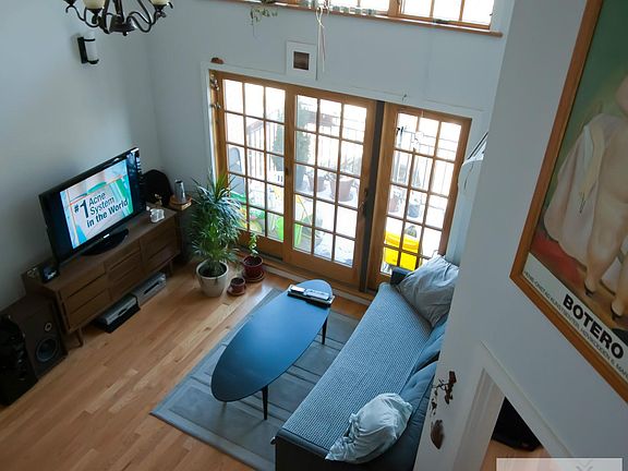 Amazing 1 Bedroom Duplex featuring Solid Oak Doors, High Ceilings and Hardwood flooring throughout the apartment. Floor to Ceiling Living Room Windows leading to Beautiful Balcony facing Tree Lined Block. Renovated Condo Finishes, Bar Kitchen with Full Size Stainless Steel Appliances, Microwave, Dishwasher, White Cabinets and Counter Space. Spacious Bathroom with Heated Floor, Shower Cabin and soaking Bathtub. The upper loft area fits King size bed plus storage space. Currently shared The main floor Bedroom fits Queen Size bed with a large closet. Upon entering the apartment you will find an additional deep coat closet. On-site washer and dryer and 3 AC units throughout the apartment. New Building with Common Roof deck. Located on Tree Lined Block. Off the Nassau or Greenpoint G train stop.