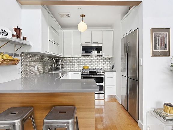 Let the sunshine IN! This sun-flooded, 4th Floor Walk-Up, penthouse duplex has been designer renovated to feature a spacious and functional layout with almost 300 square feet of private outdoor space (your own private balcony AND roof terrace!), and a large upstairs loft with floor to ceiling glass wall. You will notice the substantial quality of the construction in the weight of the solid oak interior doors, the Andersen windows, and Jonathan Adler and Design Within Reach lighting fixtures throughout. The kitchen features Samsung gas range and microwave, Haier quad French door freezer refrigerator, Bosch dishwasher, custom cabinetry and Caesarstone countertops. Enjoy radiant heated floors in the spa-like bath, complete with rain shower faucet, Italian porcelain tiles, vintage cabinet retrofit to bathroom vanity and a Kohler whirlpool tub. Friedrich ductless air-conditioning, washer/dryer, pre-wired ADT service, Comelit Door entry intercom system and Nest Thermostat complete the picture and make this gorgeous apartment an easy choice. Call today for a private viewing.