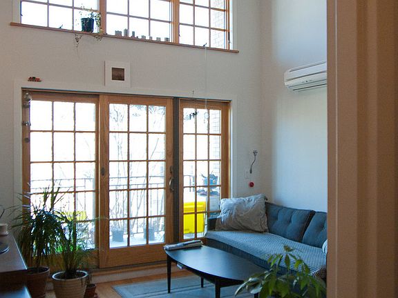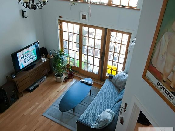 Sunlit One Bedroom with Extra Loft Space in Condo Bldg. 1 Bedroom Duplex featuring Solid Oak Doors, High Ceilings and Hardwood flooring through out apartment. Floor to Ceiling Living Room Windows leading to Beautiful Balcony facing Tree Lined Block. Renovated Condo Finishes, Bar Kitchen with Full Size Stainless Steel Appliances, Microwave, Dishwasher, White Cabinets and Counter Space. New Bathroom with Heated Floor Shower and Jacuzzi like Bathtub. Upper Level fits King size bed plus storage space. Queen Size downstairs Bedroom with closet. Additional Hallway Closets plus Laundry and 3 AC units through out apartment. New Building with Common Roof deck. Located on Tree Lined Block. Off the Nassau or Greenpoint G train stop.