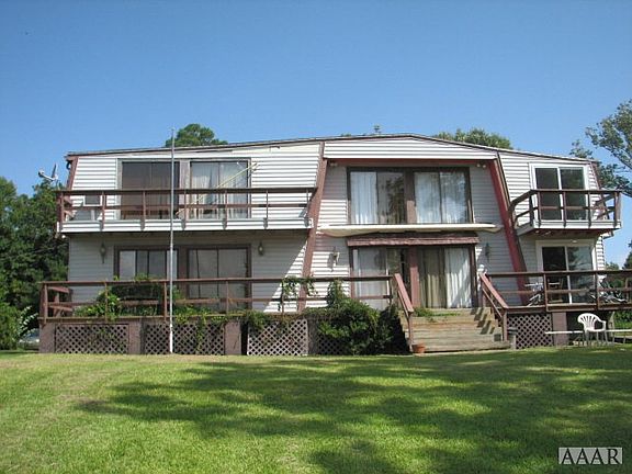 With a beautiful setting on the Albemarle Sound, this spacious & unique home is in need of TLC and features a spacious living room on the 1st level, den w FP, galley style kitchen, breakfast nook overlooking the water and 1st floor bedroom. The spiral staircase leads to a balcony overlooking the living area. You will find two additional bedrooms, a bath, craft room/office and bonus room on the 2nd level. Selling AS-IS.