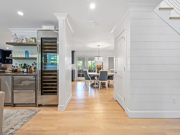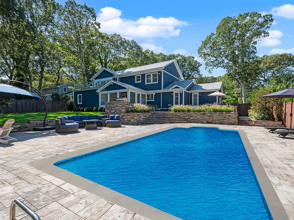 Just steps from Fleet's Neck Beach, this newly constructed retreat combines modern elegance with thoughtful design. The gourmet kitchen features two Sub-Zero refrigerators, a 60" BlueStar range with six burners, flat top, and custom hood, a Breville air fryer, a built-in Miele coffee maker, and a walk-in pantry with custom shelving. The living room, centered on a sleek gas fireplace with automatic blinds, flows into a bar area with a Scotsman ice maker, two refrigeration drawers, a Sub-Zero 100+ bottle wine fridge, and open shelving. The home also includes two EuroCave wine refrigerators, each holding over 150 bottles.There are two primary suites, one on each level, both with steam showers and custom walk-in closets. The upstairs suite opens through French doors to a terrace overlooking the pool. The driveway was thoughtfully laid with granite crushed stone with pavered aprons.Additional spaces include a gym with an infrared sauna, Tonal, Peloton, Fight Club boxing system, insulated gym flooring, TV, and fan, as well as a home office and a sunroom with convertible windows and screens.Outside, the backyard offers a heated saltwater pool, new irrigation, lush landscaping, a built-in BBQ with refrigeration, a paella or wok burner, a gas fire pit, and a cabana half bath. Dual zone central air conditioning and heat create the perfect temperature throughout the house. A whole-house water filtration system ensures clean, high-quality water at every tap. Plus, a Sonos sound system provides audio throughout the home, terrace, and backyard, while a full-house Generac generator and new septic system ensure peace of mind.