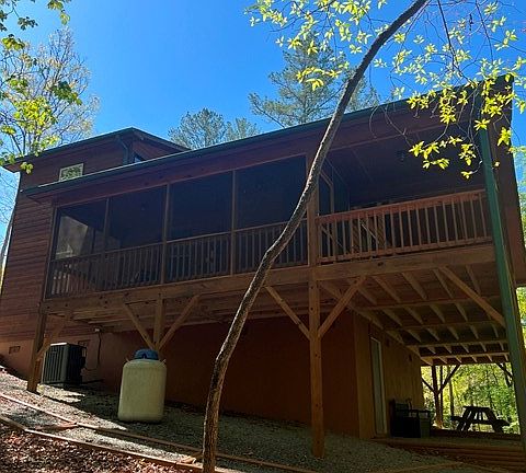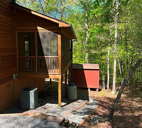 Great wooded setting at this 2br/2ba chalet in Crisp Mountain Subdivision. The house has hardwood flooring, pine ceilings, remote gas fireplace and beautiful maple cabinets with granite countertops!! There is a 2 car garage along with a small storage shed on the property and a large outdoor firepit. The home has a large wraparound porch with one side screened in. There is a small branch at the bottom of the property along with some fruit trees and bushes and the wildlife is abundant!! The subdivision offers paved roads, gated entrance, and fiber optic internet.
