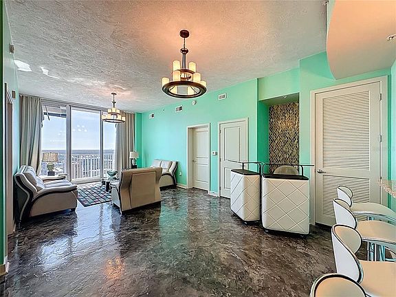 Solaire at the Plaza – Downtown Orlando’s Premier High-Rise Living....Discover urban elegance and effortless convenience in this stunning 2-bedroom, 2-bathroom condo perched on the 23rd floor of Solaire at the Plaza, Downtown Orlando’s most sought-after high-rise destination. Spanning 1,263 square feet, this fully furnished and move-in-ready residence offers a modern, open-concept layout that perfectly balances style and function. The high-shine concrete floors deliver a striking urban-industrial aesthetic, setting the tone for an interior designed to impress with vibrant and fun design. Wake up each day to breathtaking skyline views of the City Beautiful, where sunrise pours through your floor-to-ceiling windows and paints the cityscape in warm morning light. Whether you're entertaining guests or enjoying a quiet night in, this condo offers an elevated lifestyle in every sense. You'll appreciate the peace of mind provided by 24-hour security, concierge service, biometric entry, and two reserved parking spaces in the secure, nested garage. Located just two blocks from the Kia Center, Orlando City Soccer Stadium, and the Dr. Phillips Center for the Performing Arts—and only a short stroll to Lake Eola and the vibrant Sunday Market—this location places you at the very heart of Orlando’s most dynamic district. Come experience true high-rise luxury living—this is your opportunity to own a spectacular condo with the very best sunset skies at the Solaire.