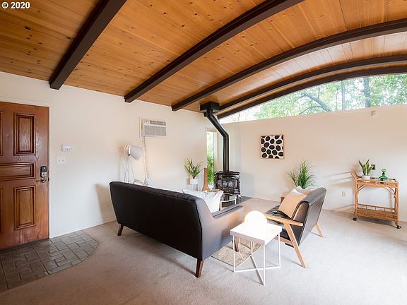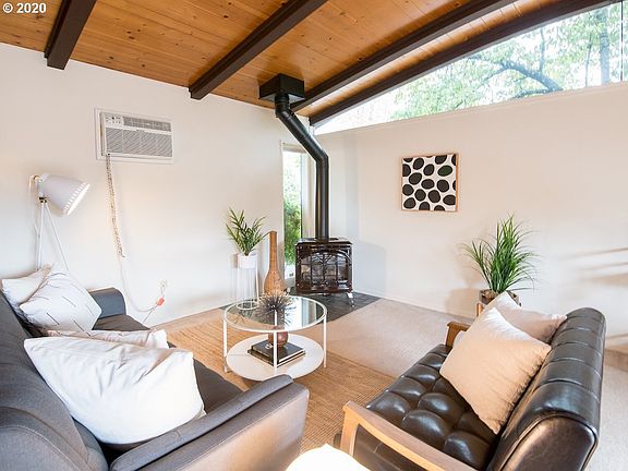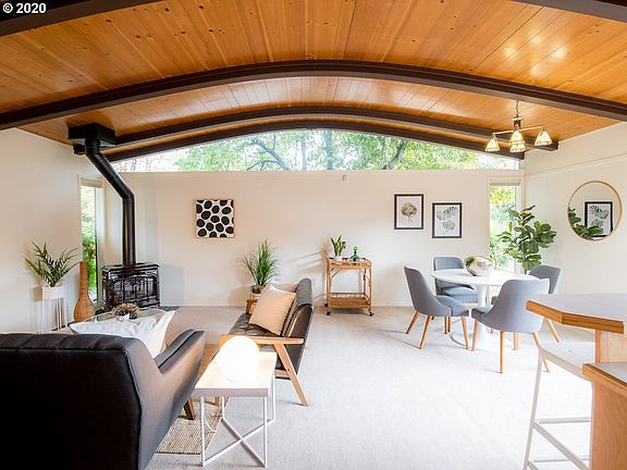 Incredible Scandinavian cabin-esque feels in this unique one-level Gresham ranch. Gently coved ceilings with beams, half-moon ceiling window with green views, & adorable gas stove add to the warm hygge vibe of this home. Thoughtful open floor plan flows from living room to dining, through to kitchen with gorgeous light, lots of space, & pantry. Bright, inviting bedrooms. A/C units. 2-car detached garage for secure parking, large side deck, neat yard. Sweet location close to everything you need!