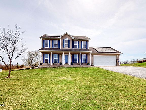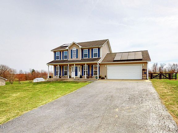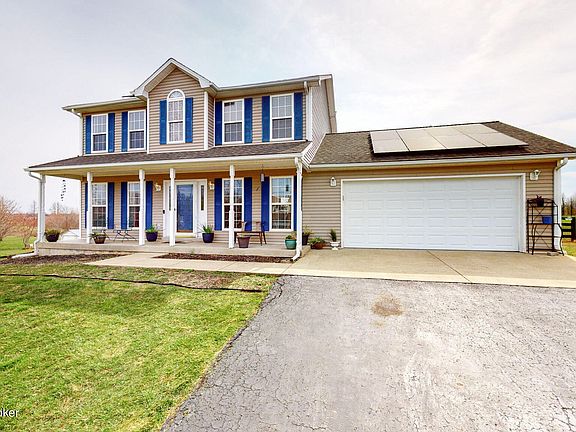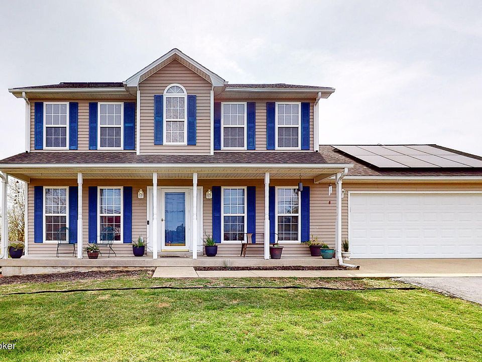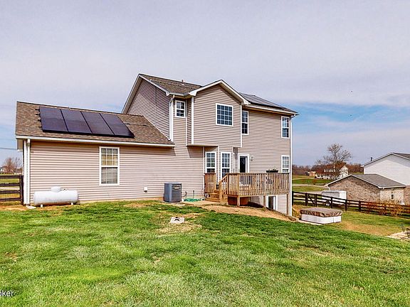 While this 2 story home in a rural setting with large fenced backyard and mature fruit trees creates a welcoming feeling, the main attraction is the array of solar panels installed over a max insulated roof that supply the home with electricity as well as charge the backup battery for 8-12 hours of continued power and even provide a source of credit by returning energy to the power company. Inside there is a wood floor foyer and this is not the typical 2 story as the stairs are at the rear of the home. With both a formal dining and living room as well as a family room with gas fireplace there is space for all plus there is a spacious kitchen with breakfast nook. Upstairs there are 3 large bedrooms and 2 full bathrooms. And then the full finished walkout basement has many possibilities. a family room, craft area, workout space, etc. The fenced backyard includes a storage shed and stone paver patio with Firepit and hot tub plus fruit bearing apple, cherry, and pear trees. Plus it is a short commute to Fort Knox and the amenities of Elizabethtown. This one deserves your attention so schedule a tour today!