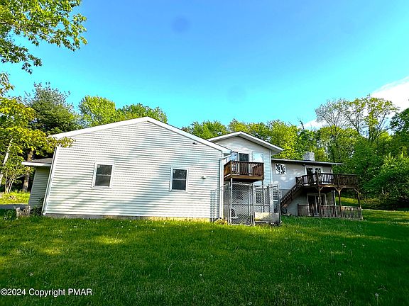 Welcome to 155 Skyview Circle! multi-level brick home tucked in the trees of Chestnuthill Twp., yet close to all major highways. Hardwood floors, multiple decks, sunken living room, stone wood fireplace, finished lower level with 3/4 bath, laundry room, wood stove leading out to rear yard. Oversized 2-car garage with generator hook-up. New electrical panels, new hot water heater and new heat pump (with A/C). 4 Bedrooms, 2 baths, large, flat 1 acre yard with view of mountains. Next door property also available....159 Skyview! Even has a kennel for your dogs! Community has lakes, tennis and basketball 1/2 mile from house!