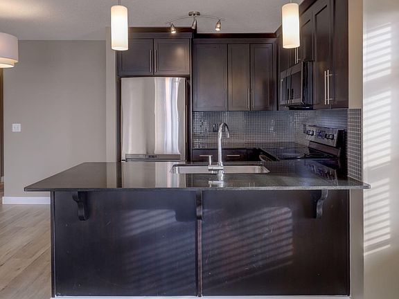 This contemporary corner unit offers 903 square foot of stylish living space with 2 bedrooms, 2 bathrooms and panoramic south-west exposure. Step out onto the balcony, complete with gas BBQ line and enjoy the stunning mountain views. Fresh laminate flooring and an open-concept design create a modern, airy feel that's filled with natural light throughout the day. The contemporary kitchen features dark-stained cabinetry, tiled backsplash, granite counter, and stainless steel appliances. The spacious primary bedroom includes a walk-through closet leading to a 4 piece ensuite, while the second bedroom and full bathroom provide flexibility for guests or a home office. The two bedrooms are thoughtfully positioned on opposite sides of the condo for added privacy - please see the included floor plan for full layout. Additional highlights include in-suite laundry, titled heated underground parking with a storage locker conveniently located directly in front of the stall. Ideally located with easy access to Stoney and Deerfoot Trail, just minutes from the airport and Cross Iron Mills, plus shopping, parks, schools, and everyday amenities nearby - including a bus stop right on the street. This move-in ready condo is available for immediate possession. It blends comfort, convenience and incredible views - a fantastic place to call home. Be sure to take time to explore the 3D virtual tour.