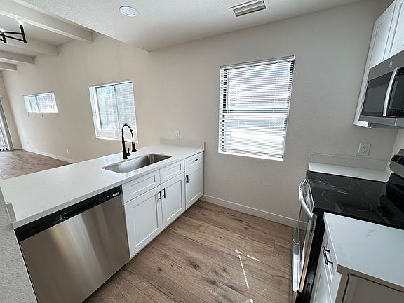 Light and Bright end unit in renovated 4-Plex. Wood inspired flooring throughout. Open floorplan, kitchen features a breakfast bar, quartz counters, all new stainless appliances and deep sink with pull-down faucet. off living room. Small deck off living room. Two bedrooms and bathroom with tub/shower combo. Unit has it own dedicated water heater, and heating and cooling unit. One assigned carport and storage unit is included. Tenant pays electric and water. Trash service is included. Up to two cats with pet deposit. Sorry, no dogs.
