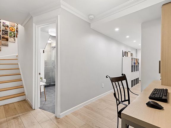 Brooklyn charm meets Windsor Terrace exclusivity in this lovely duplex condo, a turn-key 3-bedroom, 2-bathroom home nestled just two blocks from Prospect Park. Features of this 1,130 sq. ft. apartment include beautiful hardwood floors, a renovated kitchen, crown molding, split-system A/C's throughout, a home office, chic built-ins, and a convenient in-unit washer/dryer. A verdant front lawn, manicured plantings, and classic redbrick façade frame a private walkway leading to an elegant wrought-iron-gated front door. The upper level of the home begins with an open-concept living, dining, and kitchen space with vibrant eastern light. The renovated corner kitchen is modern and bright, equipped with custom cabinets, sleek stone countertops, a white subway tile backsplash, and a suite of high-end stainless steel appliances. A quiet guest bedroom with built-in storage and a travertine marble full bathroom complete the upper level. The lower level of the home contains a pair of bedrooms, a home office, laundry room and a full bathroom. The primary bedroom is large enough for a king-size bed and has side-by-side reach-in closets, while the secondary bedroom has built-in storage. Both bedrooms share access to a large full bathroom with travertine marble walls and floors and a step-in rain shower. The Prospect Park Mews is a desirable 55-unit condominium situated in the heart of Windsor Terrace. The building is professionally managed and offers thoughtful lifestyle amenities including a tranquil landscaped courtyard, common laundry, private off-street parking with a short wait-list, and a recently renovated spacious shared rooftop deck with dining and lounge furniture and a grill. It is two blocks from Prospect Park, and it is moments from a variety of local restaurants, bars, cafes, and shops. The F and G subway lines are less than five blocks away. Pets are welcome.